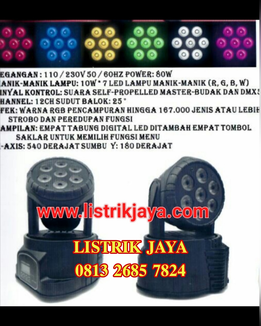 - Daya 10W x 7 Warna Tegangan AC 110 – 230V 50/60Hz.
